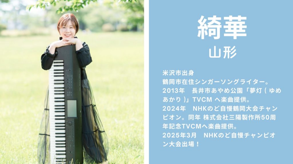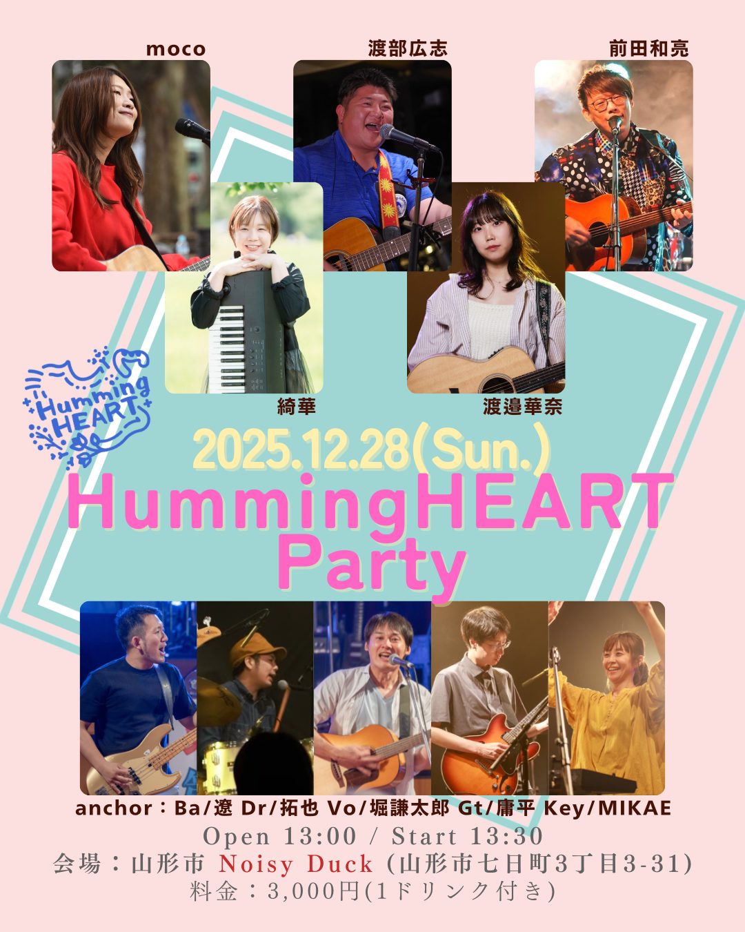 2025.12.28 [13:00~]『HummingHEART Party』山形 Noisy Duck イベント情報 2025.12.01 お申し込み ▼出演者紹介 各アーティストの画像をクリック・タップすると、それぞれのホームページやSNSをご覧いただけます。また、それぞれのステージで、この日限りのスペシャルコラボがあります!どうぞお楽しみに★ 13:30~ 渡部広志 14:05~ 渡邉華奈 14:45~ 綺華 15:20~ moco 16:00~ 前田和亮 17:15~ anchor / 堀謙太郎 お申し込み